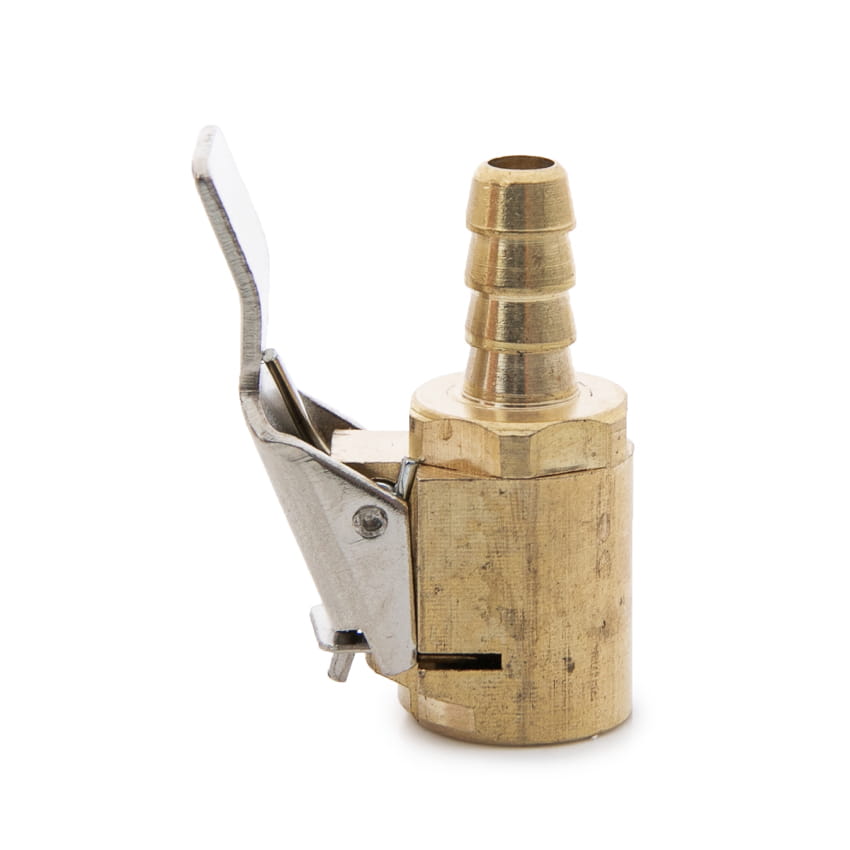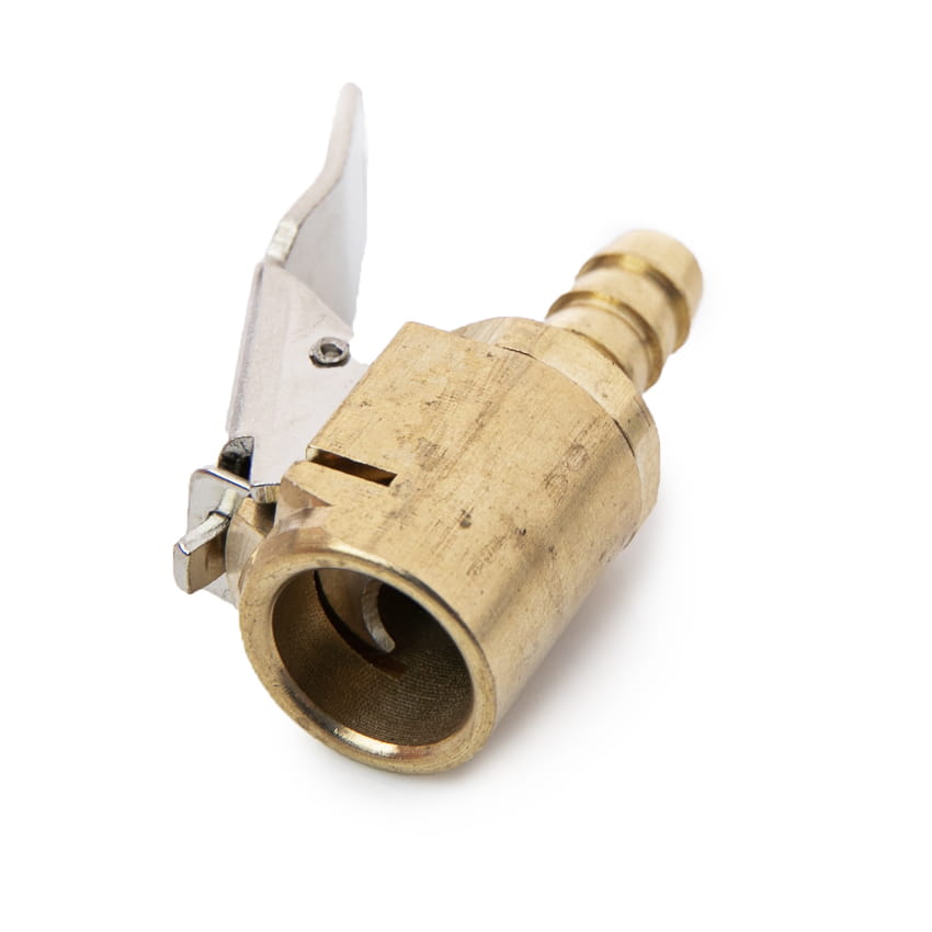 Mosiężna końcówka do pompowania kół marki Fadroma, zaprojektowana z myślą o wygodzie i bezpieczeństwie użytkowania. Wyposażona w praktyczny zacisk zatrzaskowy, który zapobiega samoczynnemu odłączeniu węża podczas pracy. Końcówka posiada nypel do węża o średnicy 8 mm, co zapewnia solidne i szczelne połączenie.