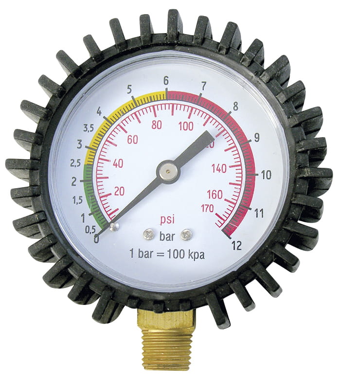 - Skala: 0-12 bar oraz 0-170 psi – podwójna skala dla wygody użytkownika.