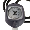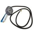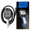 Manometr AIRFORCE II został opracowany z myślą o intensywnej eksploatacji w serwisach ogumienia. Skala jest czytelna, korpus zabezpieczono odporną na uszkodzenia gumą. Rękojeść jest ergonomiczna, idealnie leży w dłoni. Do sterowania pompowaniem służy wygodna rączka z tworzywa sztucznego. Regulacja ciśnienia możliwa jest jedną dłonią. Służy do tego przycisk umiejscowiony na korpusie skali, który obsługuje się kciukiem. W górnej części korpusu pistoletu przewidziano otwory do zawieszenia w wybranym miejscu np. na kolumnie montażownicy do kół. Pracę ułatwia dwuzakresowa skala, użytkownik ma do dyspozycji pomiary w bar (0-12) lub lbf/in² (0-170). Maksymalne ciśnienie robocze określono na 15 bar, przewód o długości 180 cm ma wytrzymałość aż 20 bar. Przewód zakończono wytrzymałą końcówką zaciskową. Pewnie mocuje przewód z zaworem, pozwala na bezpieczne pompowanie lub obniżanie ciśnienia w oponie.