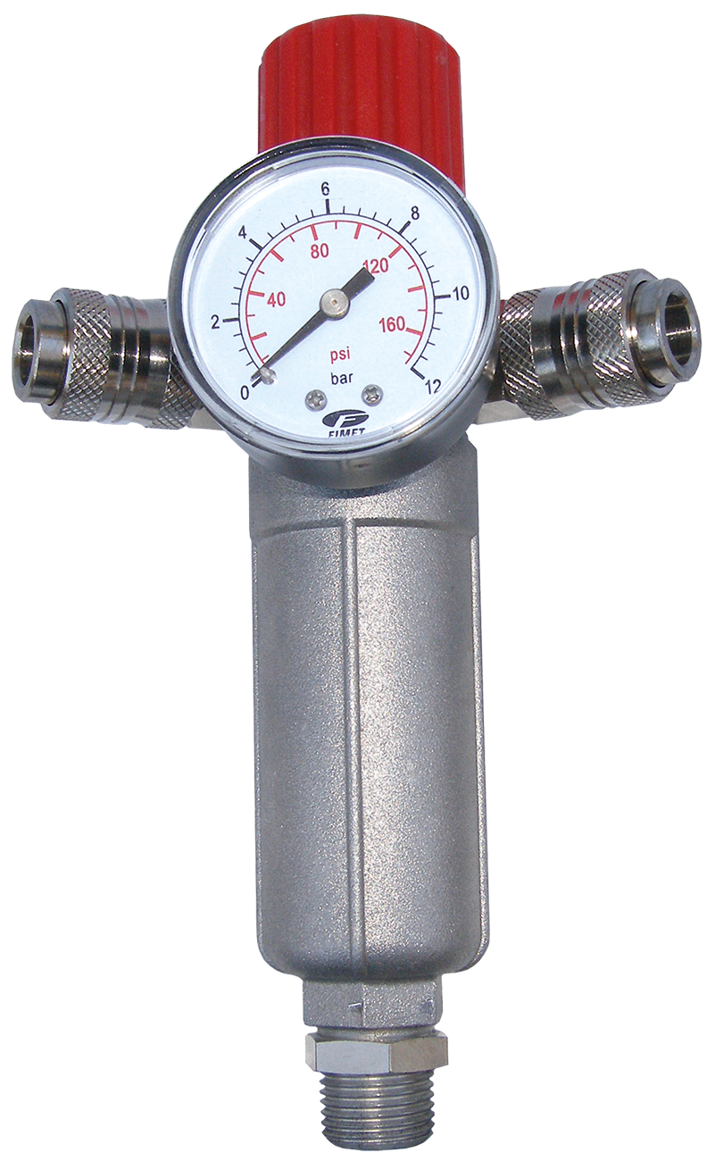 Profesjonalny membranowy reduktor z markowym wskaźnikiem ciśnienia firmy FIMET wyskalowanym w barach i psi, oraz w filtr wstępnego oczyszczania powietrza o filtracji do 25 mikronów. Kondensat zebrany przez filtr wraca do zbiornika kompresora skąd należy go spuścić przez spust kondensatu zbiornika. Na wyjściu zamontowane są dwa uniwersalne szybkozłącza pozwalające wpiąć wszystkie złączki, wtyki dostępne na naszym rynku. Produkt produkcji znanej włoskiej firmy OMG. Taki typ reduktorów jest montowany na profesjonalnych olejowych kompresorach powietrza z dwucylindrowymi pompami napędzanymi paskiem.