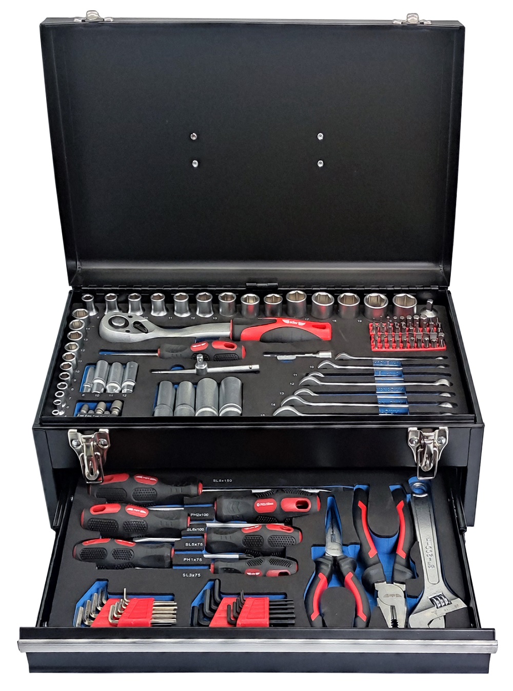 Gumowane rękojeści zapewniają wygodny i pewny chwyt narzędzi. Komplet znajduje się w wytrzymałej metalowej skrzynce narzędziowej z szufladą na mocnych prowadnicach.