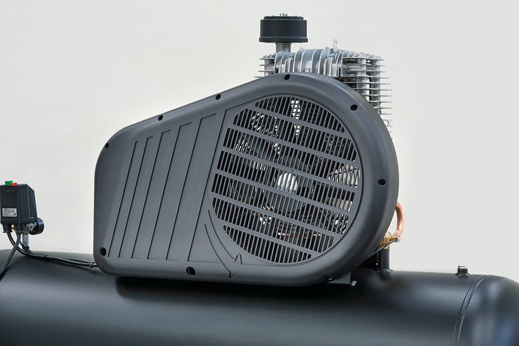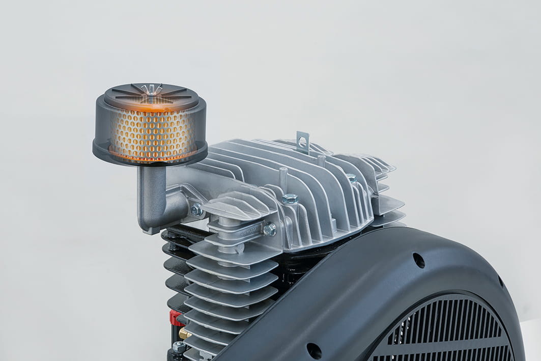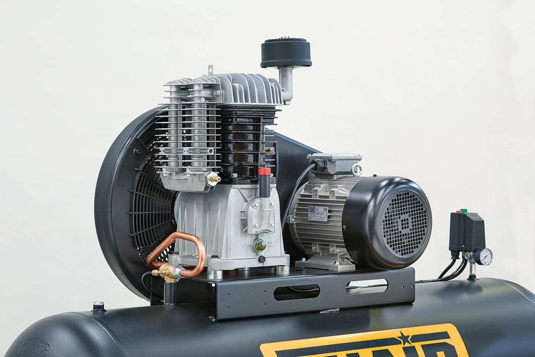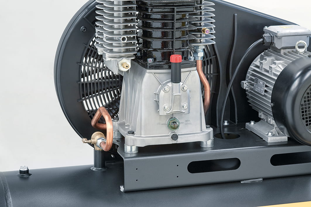 Pompa 2-stopniowa z żeliwnym cylindrem – wydajne chłodzenie dzięki dużym chłodnicom międzystopniowym i końcowym.