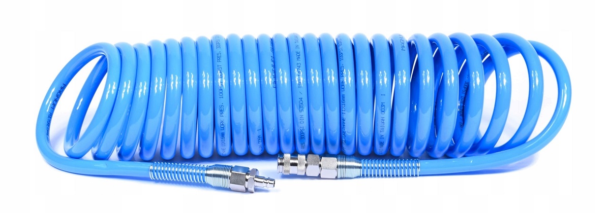 Przewody spiralne PU ze złączkami dzięki okuciu w uniwersalną szybkozłączkę i złączkę są natychmiast gotowe do pracy.Podana długość jest całkowitą długością prostego przewodu przed ukształtowaniem spirali. Należy o tym pamiętać przy wyborze długości węża.Poliuretan przewody z niego wykonane charakteryzują się największą elastycznością i odpornością mechaniczną (zginanie, zgniatanie). Najlepsze do pracy z narzędziami pneumatycznymi, jako przewody spiralne oraz w zwijadłach.
