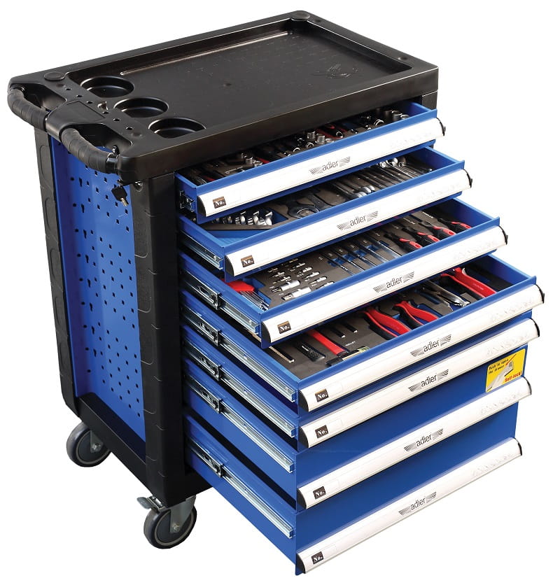 Wysokiej jakości wózek narzędziowy. Metalowe ścianki wzmocniono narożnikami z tworzywa. Wózek wyposażony w 7 pojemnych szuflad na masywnych prowadnicach. Wbudowany zamek na kluczyk, blokujący wszystkie szuflady. Duże koła z hamulcem. W czterech szufladach znajduje się łącznie 217 elementów wyposażenia. Całe wyposażenie zostało wykonane ze wzmocnionego stopu stali narzędziowej Cr-V (Chromowo - wanadowej) Trzy dolne szuflady pozostają do Państwa dyspozycji.