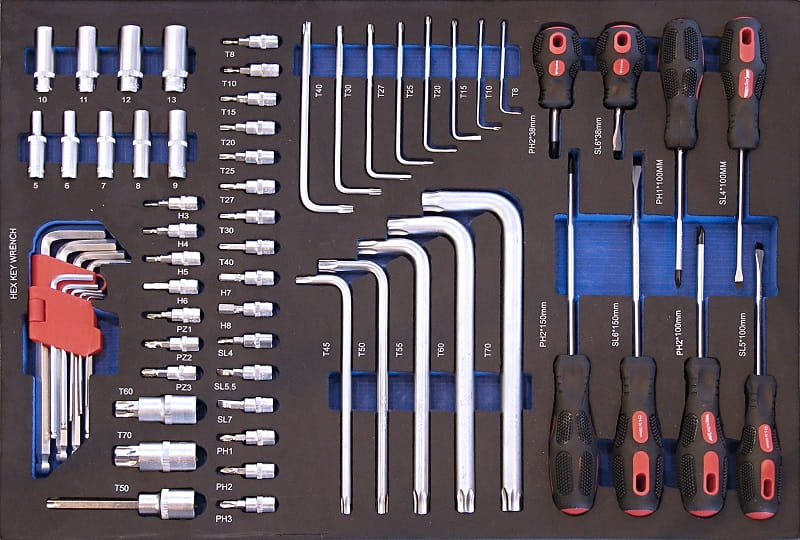 - Zestaw 13 kluczy imbusowych typu Torx: T8, T10, T15, T20, T25, T27, T30, T40, T45, T50, T55, T60, T70