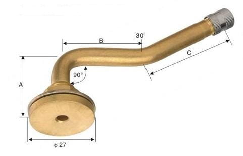 Specjalne wymiary oraz kąty zgięcia zapewniają kompatybilność z większością standardowych dętek rolniczych i ciężarowych. Szeroka średnica podstawy 30 mm gwarantuje pewne mocowanie i szczelność.
