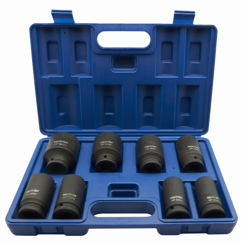 Zestaw nasadek udarowych długich 3/4" 8 sztuk ADLER to specjalistyczne nasadki udarowe Adler, przeznaczone do współpracy z urządzeniami pneumatycznymi, które pracują w bardzo ciężkich warunkach pod zmiennymi obciążeniami. Nasadki wykonano ze stali chromowo molibdenowej (Cr-Mo).