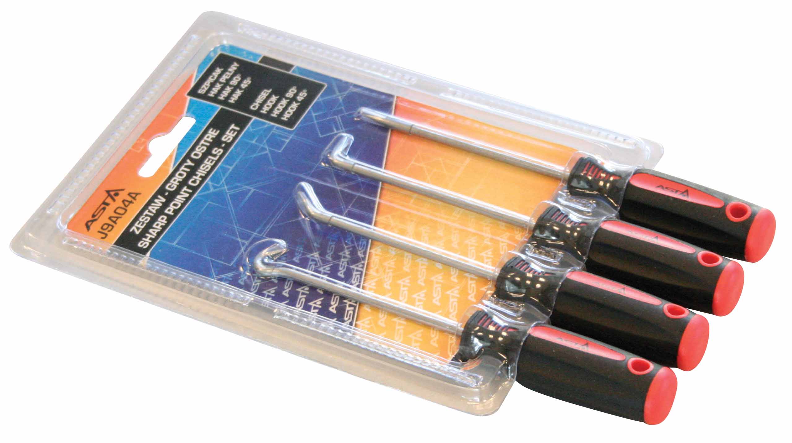 Profesjonalny zestaw grotów ostrych zawierający cztery różne kształty: szpic, hak 90º, hak pełny oraz hak 45º. Narzędzia te są niezbędne w wielu pracach precyzyjnych, montażowych i serwisowych, gdzie wymagana jest dokładność i komfort pracy.