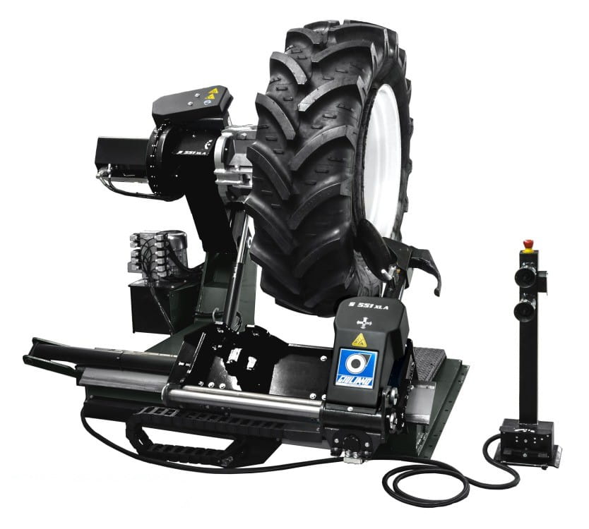 Profesjonalna montażownica GIULIANO S 551 XLA do obsługi kół pojazdów ciężarowych, autobusów oraz maszyn rolniczych i budowlanych o zakresie 14-45/58” (średnica 2300 mm, szerokość 1100 mm). Wyposażona w dwubiegowe, hydrauliczne szczęki z automatycznym obrotem oraz mobilną jednostkę sterującą.